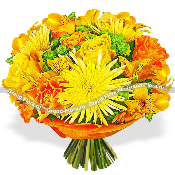 ЛЮКС: хризантема одноголовая желтая - 5 шт., роза оранжевая - 4 шт., роза желтая - 3 шт., альстромерия оранжевая - 4 шт., хризантема кустовая зеленая - 4 шт., фетр оранжевый. Примерный диаметр букета 40х40 см.