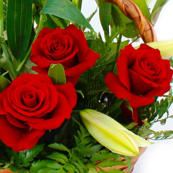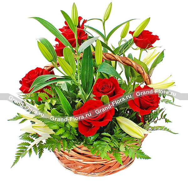 Прелестная корзинка ярко-красных роз в нежном обрамлении белых лилий напоминает красивую историю любви , которая под покровом Вашей заботы останется неизменно романтичной и взаимной. Только в Ваших руках возможность подарить эти чувства любимой!