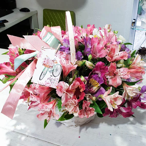 Альстромерии розовые и фиолетовые – 21 шт.,оазис, корзинка.