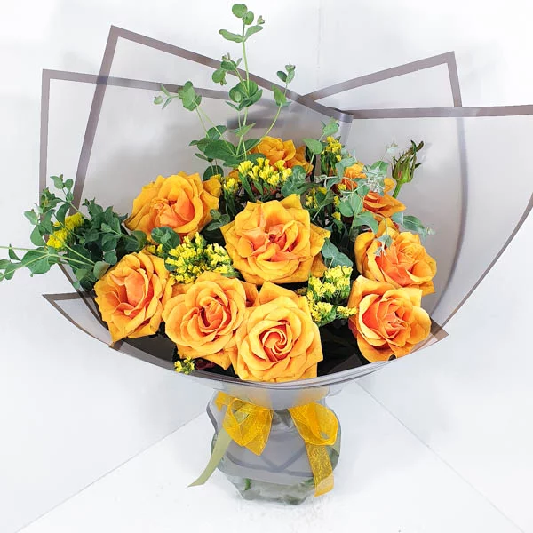 Внимание: цвет роз может отличатся в виду природного происхождения. Допускается оттенок от желтого до оранжевого. Декоративная зелень  может быть заменен на другую стилистически подходящую.