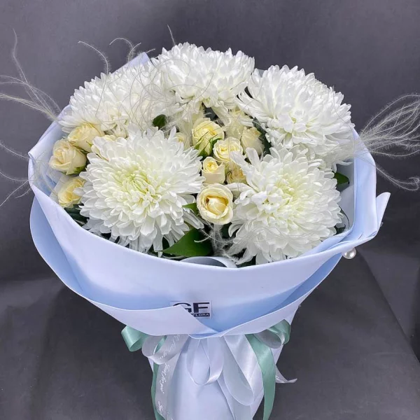 Элегантный букет из белых хризантем и роз- это классическое, но в то же время современное цветочное произведение, которое никогда не потеряет своей актуальности и всегда будет радовать изысканной и такой нежной красотой.